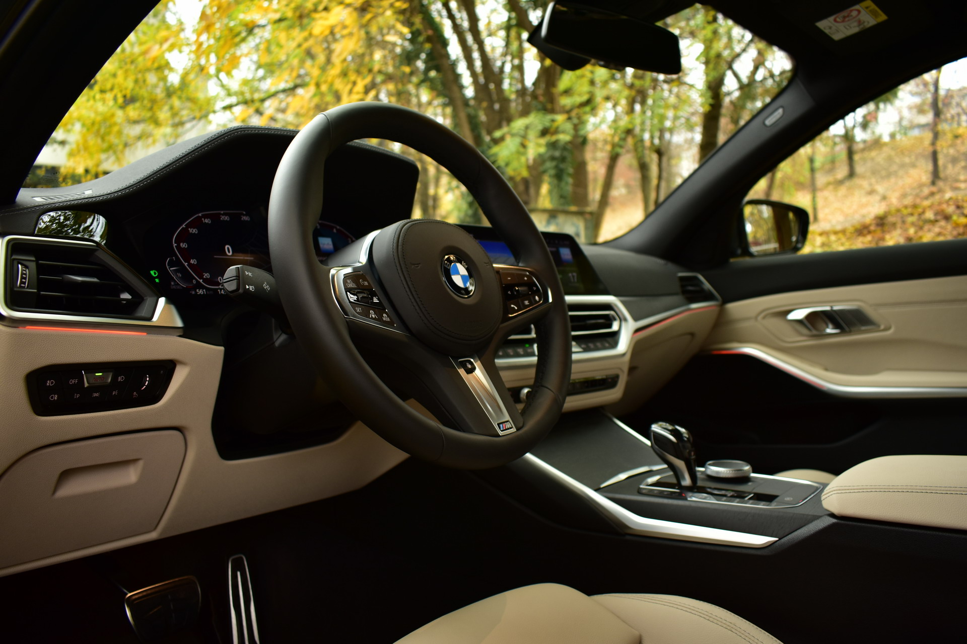 The test car was equipped with the high-end BMW Live Cockpit Professional, which employs a fancy 12.3″ digital instrument cluster and a 10.25″ control display for the BMW OS 7.0 infotainment system. The interior was adorned in a bright Vernasca Oyster leather upholstery and dashboard trim in fine ash wood with open-pore texture, adding a luxury feel to the G21.